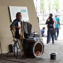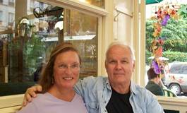 I was still writing when Tom was ready to go out yesterday, and he still wanted to see more of the rue Cler brocante, which I did not, so he left for Sunday’s grand promenade an hour earlier than I did. I left the apartment at about 1PM and met Tom at the entrance to the garden of the Branly Museum, one of our favorite green spaces in Paris. It takes a half hour, walking at a brisk pace, to get there from where we live. From there we did our usual Sunday walk except that this time, we changed course a bit. At the gorgeous Pont Alexandre III, we found the July exhibition was still going, although its poster said it was to have ended on July 7. Produced by an organization called the Gardiens des Ponts, the show was strange, as is typical for this group. Also, it was typical for it to be extended. The exhibition takes place in the odd interior of the bridge’s substructure, accessible from the riverbank, below the normal street level. Called “The Eternal Feminine,” the exhibition features 25 large-scale photographs of women by Eric Ouaknine. The sponsor is Master Pierre Cornette de Saint Cyr. Continuing on our walk, when we reached the Passerelle Solferino, we decided to cross the river and walk on the other side. Normally we would not do this because in the summer, that right bank is just too hot because the cobblestones and floodwall heat up in the sun. But with this week’s moderate temperatures (in the 70s, F) and cloudy skies, walking there was just fine. We are probably among the few in Paris who prefer these temperatures and skies. For south Floridians, this weather is a real blessing. It even rained on me a little as I walked up to the Branly Museum! The sprinkles of cool rain brought joy to my heart. At last, at the Pont Louis Philippe, we were hungry and footsore. So we ascended and inspected the restaurants on the pedestrian street called the rue des Barres, behind the Saint Gervais church on the right bank, just beyond the Paris city hall. The Café Louis Philippe met the Cooley criteria and it advertised the special of the day, leg of lamb, on the chalkboards. Leg of lamb on Sunday afternoon sounded like a good idea. Not lunch, not dinner – just this nice Sunday meal at about 4PM. That was all we needed to make it a great Sunday. And so we did. The French couple next to us took our photograph, at their insistence. It would have been impolite to say no. The food was excellent, and the service was lousy. The setting, in a covered outdoor area, was very nice. But the restaurant shows signs of being under-capitalized, and I’m a little worried about its financial state. Tom had to go inside to the bar to pay with a credit card, and the bill was never entered into a cash register or computer. I don’t really want to say what I think could be happening here. On the way home, we stopped for a while to listen to our favorite one-man-band, Bernard Constant, in the Solferino entrance to the Tuileries Gardens. He’s getting older, and so are we, and he still amazes us with his multi-tasking musical talents. Speaking of getting older, my feet can no longer tolerate wearing normal street shoes or sandals on these walks. On weekends, on cobblestones, I now must wear athletic shoes. I now think that is okay on a summer weekend in Paris. I’m changing my rules. Tom was too tired to walk the rest of the way home, so we descended to the metro at Solferino, and made an efficient change to the line 10 at the Sevres-Babylone station. So we came back out on the street at the Emile Zola station, right in front of our favorite organic bakery, which was still open. My new favorite bread is their small, round multi-grain country bread. Tom still buys a baguette and some kind of sweet pastry every time he goes in that shop, but I’m really happy with the healthier stuff. We were too late in arriving home to watch the end of the day’s stage of the Tour de France. So we caught the after-tour show on TV, and looked up the results of the day on the letour.fr web site. Today is a day of repose for the Tour, and Tom does not have work from the publisher in New York, so we’ll probably do something different today. On va voir. Aha! I just caught the fact that the yahoos at Yahoo Geocities had obliterated my Paris Journal for 2002. So I just moved it to my Comcast site. Here’s a link to it, and I fixed the link on my homepage at barbarajoycooley.com. Sign