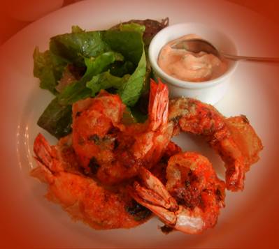 charcuterie platter, above, and the jumbo shrimp croustillants a la tandoori, below, at Cristal de Sel.