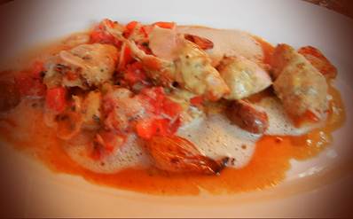 porc basque, jambon de Bayonne et autres charcuteries. Tom decided to try this platter of charcuterie from the southwest of France, consisting of a duck terrine, smoked duck breast, Basque pork pâté, Bayonne ham, and more. It was all delicious. I ordered the croustillants de gambas à la coriandre, sauce aux épices tandoori, as I had on September 14. If anything, this jumbo shrimp appetizer was better than ever, if such a thing is possible. Like last year, “these were delicious and fascinating, with the paper-thin pastry covering that mimicked the look of the shell which had been removed, and the Indian spice. The shrimp were accompanied by a pretty little salad of dark greens.” For his main course, Tom ordered what I had on September 1 last year: ravioles de langoustines, embeurrée de choux et beurre de nage. I didn’t take a photo of it last night, but the photo from September is on the September 2, 2011, journal page. Langoustines are like small lobsters. They are not, as some web pages say, prawns. Gambas is the French word for prawns. Lobster, or homard in French, is generally better if it comes from the waters near Maine (or even Florida), not Europe. But go ahead and order the shrimp, prawns, and langoustines in France; at a good seafood restaurant, they can be truly wonderful. And such is the case at Cristal de Sel. Tom pronounced his langoustine ravioli as “delicious” and the butter-soaked cabbage as “delightful.” My main course was the râble de lapin à la moutarde cuit au four, tartare de tomates anciennes à la marjolaine et oignons rouges rôtis, sauce des carcasses: oven-roasted chunks of rabbit served with an exciting assortment of garnishes, including old-fashioned stewed tomatoes, roasted red onions, mustard, and a shellfish sauce. Different flavors exploded in my mouth as I ate from different parts of the concoction. It was an entertaining and delicious dish to consume. There were two servers working the dining room last night. The younger one seemed to be a bit somber at first. The other man was more at ease, and we remembered him from last September. But even the younger one warmed up as dessert time approached. Ah, dessert. We could not resist ordering the aumônière de crêpe, pommes confites au caramel sale again. In fact, we ordered two. Better than apple pie, these apples are cooked and wrapped in a crêpe. The rich, dark caramel sauce that the surrounds the crêpe sack of apples is divine. Thank you, Chef Karil Lopez, for helping us to celebrate an important stage in a new book’s production. It could not have been a better dinner. The restaurant will close for the annual vacation on the 22nd until August 20. I dearly hope that we will dine there again this year – maybe more than once. Three courses for each of us is a rare occasion anymore. This is not because of the cost; it is our age that curbs our consumption. Of course we do not need to order all three courses at such a restaurant; but when we go to someplace that is this good, it seems unwise not to take advantage of the opportunity to experience wonders. Other Sanibellians have now invaded France: our friends Jim and Maddy are on their houseboat/barge, in Carcassonne, and they’ll be exploring the waterways of France once again this summer. We might be able to meet up with the chef/caterer Leslie and her son this evening. Hope so. And even more will be arriving later this month and in September . . . . |