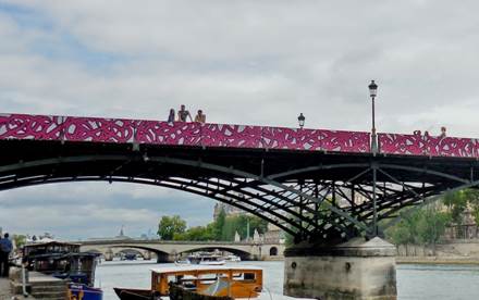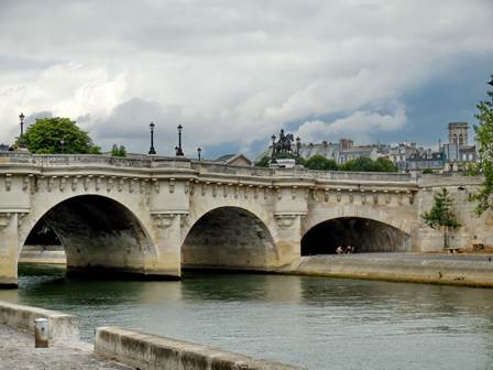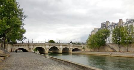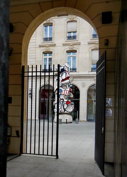 Directly across the street, a rifle-toting soldier stood on guard. Was he guarding something/somebody in the old building behind him? Or was he just stationed there because of proximity to main tourist attractions like Notre Dame? I don’t know. He was an unusual sight. We crossed the busy quai and descended the steps to the Porte de Montebello, where we began our trek homeward, on the banks of the Seine. We noted that the café boat called the Six-Huit is gone, now replaced by a couple of smaller boats and a bigger one owned by Maxim’s. The Maxim boat has the amusing name: Bateau Ivre (drunken ship). Rain started falling. We paused under a few bridges, and then the sky brightened. After we passed under the Pont Saint-Michel, we admired the view toward the Pont Neuf. I can see why Francis LeCoadic chose to paint that view in January or February of 1956, and I am so happy that we now have that painting. Sharing a rendition of a beautiful view in Paris is another way of showing your love for the city. At the Quai Voltaire (where Voltaire did indeed once live) we had to climb up to the street level, because the cobblestoned riverbank ends there. Just before we reached the Musée D’Orsay, I saw a sculpture in front of the Caisse des Depots, and wondered if it was a Lichtenstein. Later, I learned that it was a piece by a French sculptor named Jean Dubuffet, but that there is indeed a large Lichtenstein sculpture just inside this building, in the hall! In front of the Musée D’Orsay, we were able to descend once again to the riverbank, now in the section that is part of the Berges de Seine project. So there were lots of amenities – things to see, places to sit, games for adults and children. We stopped at the Rosa Bonheur café boat for refreshments. There Tom discovered another brand of ice cream that he appreciates: Alperel. At the bar, where one places one’s order at Rosa Bonheur, Tom asked for ice cream, vanilla and chocolate, meaning one scoop of vanilla and one scoop of chocolate. Instead, he received two little containers of ice cream, one vanilla and one chocolate, at 6 euros each! It amounted to something like four to six scoops of ice cream! I thought that was pretty funny, but then I had to help him eat some of it. Normally, I’d pass on ice cream in the afternoon. At 2 in the afternoon, the Rosa Bonheur was uncrowded. We sat by a window at a long table that we had to ourselves, and we felt the boat move gently while we watched the water glisten and the tour boats pass by. Having the space and the view was relaxing. When we felt restored, we continued our walk to the Pont de l’Alma, where we climbed back up to the street level, crossed the Place de la Resistance, and began walking down the avenue Rapp, for the first time this summer. We paused briefly to admire that wonderful Art Nouveau building with the salamander door hardware and then continued, to the Champ de Mars. We crossed through the usual crowd there, and then selected the quiet avenue Charles Floquet to continue on to the avenue de la Motte Picquet. We like walking the length of the avenue Charles Floquet because it is quieter and less dusty than the Champ de Mars, but also because of the elegant Haussmannian buildings lining each side of the street. There are no commercial businesses on that avenue, just beautiful trees and buildings. Once we were home, we did the usual: watched the Tour de France on channel 2, and got ready for dinner. Dinner was down on the avenue Félix Faure again, this time at Axuria. We’re running through our list of local favorites, and soon will have to start making repeat visits to some of them. Axuria did not disappoint, although we noticed that this restaurant, too, has shortened its menu. Shorter menus are definitely a trend. Curiously, there is no longer any lamb on Axuria’s menu. That was originally one if its main specialties. There were still several seafood offerings, but we each chose to have the veal instead. It was a great choice.