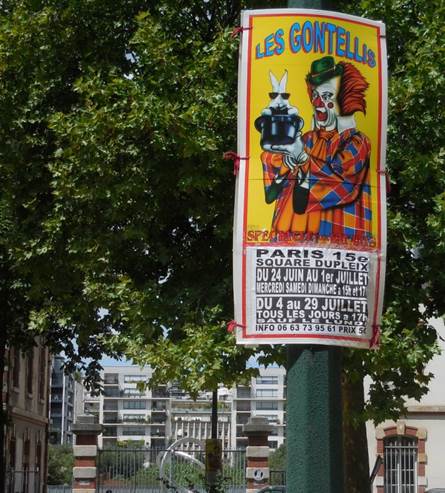 | “There they are again!” I said to Tom. We’d just entered the Square Dupleix, and I’d spotted the brightly colored tent. Every July, it seems, the Gontelli’s mini-circus sets up in this charming little park, not far from the Champ de Mars and the Eiffel Tower, tucked into a quiet residential neighborhood. We like this little park, which is very much oriented toward families with small children. For the sake of the children, there are many rules in Square Dupleix, and graphic signs illustrate each one.