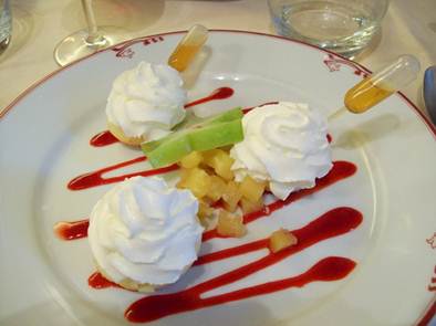 The sun was shining and the temperatures were in the low 70s. Does it get any more perfect than that? Tom had a great idea. He said, “Let’s walk over to the Rodin Museum to have tea in the garden!” Off we went. We did not have to wait in line for long, and the entrance fee just for the garden is only 1 euro per person. The little sparrows in the outdoor café always entertain us when we visit this gorgeous green place. Much of the great sculpture – like The Thinker – is out in the garden, not in the museum. If we are going to do this tea-in-the-garden thing regularly, we can buy a one-month pass for 6 euros per person. That’s a thought . . . . We lingered for a long time over “tea” (coffee and cake for Tom, and a glass of chardonnay for me). Then we took our time walking all around the garden. Sauntering home, we stopped in both of the little parks on either side of Les Invalides: Square Ajaccio, and Square Santiago du Chili. Square Ajaccio has a statue of General Henri Gouraud, not to be confused with the General Henri Giraud whom I mentioned in yesterday’s journal entry. Now I’m never going to be able to keep those two straight in my mind. If I can just remember that Gouraud is the older one, the one who lost his right arm . . . . He was the military governor of Paris. Also in the Square Ajaccio is a fine marble statue called “Home Defense” by Émile Boisseau (1887). In Square Santiago du Chili, several young American couples with kids were starting to gather for a children’s birthday party. They had a colorful picnic all set up, complete with a number of bright plastic child-size chairs. Cute. After we rested at home for a little while following our adventure, we decided to go out to have a fine French dinner at L’ Épopée again – just as we did last Saturday night. I had the rabbit in homemade tagliatelle pasta with a gorgonzola sauce. Beautiful, and delicious. Tom ordered the filet of beef with a dark, rich reduction sauce, and little sautéed potatoes. The filet was tender and excellent. The portions are not large at L’Épopée, so we each had room for dessert. We each ordered a Baba au Rhum. While much more beautiful and refined than the Baba au Rhum at the Café du Commerce, we still appreciate the Café’s Baba very much. There was something so real and honest about the way they plunked the entire bottle of rum on our table, and the pound cake was one big chunk that we could easily share between the two of us. L’ Épopée’s Baba consists of three light, delicate balls of cake, smothered in a fluff of whipped cream, set upon a plate with a drizzle of raspberry sauce, and accompanied by a carpaccio of diced pineapple. The rum is administered via little plastic vials that you squeeze to release the rum right into the cake. Very interesting.