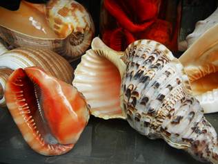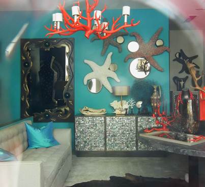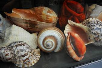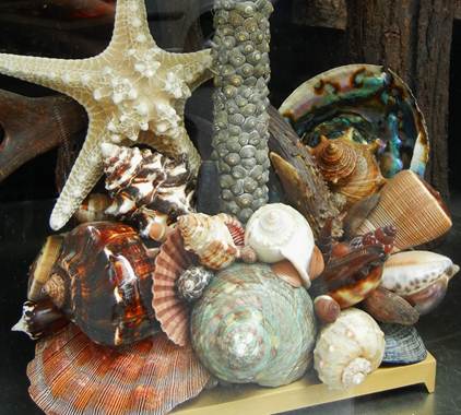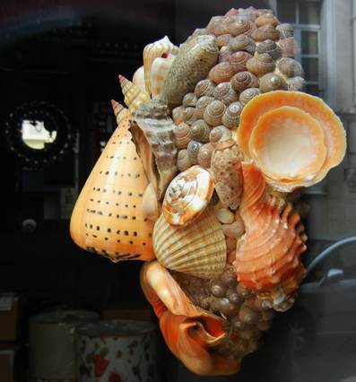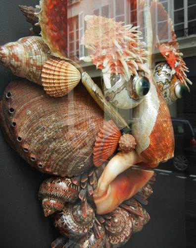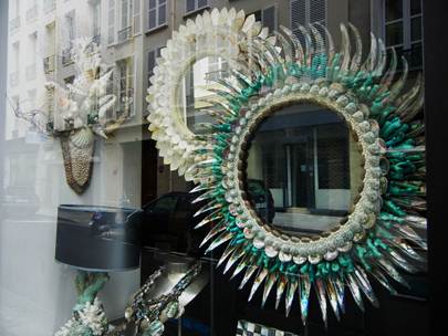 mirrors, necklaces, sculptures, and shell lamps in a shop on the rue de