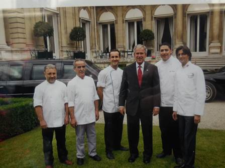 We wandered up the quaint Passage Jean Nicot in the 7th arrondissement after we’d finished our errand at the American University of Paris. The university offices that we visited are in an office building tucked behind the elegant Saint Jean evangelical Lutheran church on the rue de Grenelle. Alongside the church is a little park that is popular among 7th arrondissement tots because of its play area. The church is set back in a courtyard. When you enter through the gates on the rue de Grenelle, immediately to the left is a very old Tudor-style gatehouse. In past years, we’ve noted that the gatehouse was in shambles. This year, we’re pleased to see that it is being restored. Sometime when the workers aren’t standing in front of it, I’ll photograph it for you. It is quaint. We were in the mood for more quaintness, and that drew us into the Passage Jean Nicot. It could be a movie set, with its narrowness, and humble wooden shuttered doorways and window openings. The narrowness makes this tiny street hard to photograph. At the end of the Passage, we passed under an archway formed by a building that passes overhead. We turned left onto the rue Saint Dominique, which is a delightful street of shops. This year, it isn’t quite as delightful because there is much work going on in the substructure of the street. Lots of construction barriers and holes mar the edges of the street and sidewalk, creating considerable blockages to the flow of pedestrians and cars. We continued on because we wanted to see where our friend’s offices would be moving. Next year, he won’t work behind the Lutheran church; instead his office will be in a modern building tucked into a row of Haussmannian buildings on the rue Saint Dominique. Just before we reached the new building site, we noticed the rue de l’Exposition on our left. The restaurant where we will dine tonight is on that street, so we decided to go take a look at it, from the outside. On the way, we noticed a bistrot owned by Pierre Excoffier, a chef who has a great name for a chef (see Auguste Escoffier in Wikipedia). Excoffier’s bistrot looks attractive, so we crossed the street to examine the menu posted in the window. It was then that we noticed framed photographs in the window, featuring the chef and both Presidents Bush. One of the photos seems to have been taken in the garden of the Hotel Matignon, where the Prime Minister’s offices are located.