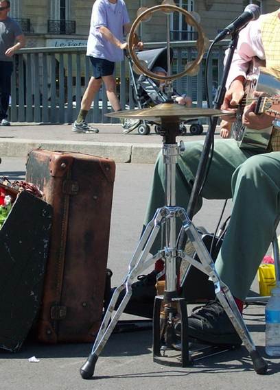 country boy performing on the Pont Saint Louis. His rhythm section: a cajón, high-hat and