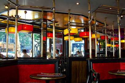 colorful interior of the Mondrian brasserie. |