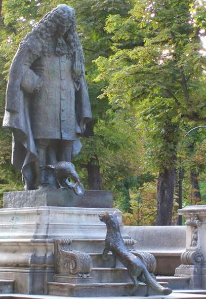 depicting La Fontaine’s fable about the crow and the fox, in the Jardins Ranelagh.