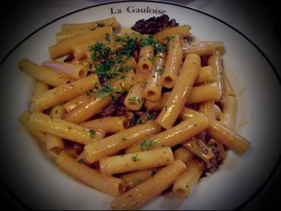 Gauloise, Le Coq au Trocadéro has no web site. We continued on up through the little streets of the 16th, headed for the Place Victor Hugo – one of Tom’s favorites. On the way there, we passed through a shopping mall that consists of a number of small shops plus the most enormous grocery store I’ve seen in Paris. It is called Casino. We exited the mall, and there in front of us was a very old covered market building on the rue Mesnil and the rue Saint Didier. Only now do I realize that the old covered markets were the precursors to the modern shopping mall. We briefly visited the Sainte Honoré de l’Eylau church on the Place Victor Hugo. I’m sure we’ve been there before, but I did not remember the Turkmen Bokara Tekke rugs that cover the entire floor of the sanctuary. People were starting to come in for the 6:45PM daily mass (every day except Saturday). We sat quietly for a short while, admiring the simple beauty of that place, and then we went on, circling the Place and its majestic fountain, and continued on toward home on the avenue Raymond Poincare, where we saw another church, a chapel with a beautiful façade, that is also part of this same parish. We visited the park at the lower end of the northwest side of the Trocadéro, sitting on a bench for a while, admiring the Victory Dance statue. After crossing the Seine with the masses, we walked right under the Tower, stopping briefly to check out the menu for the Jules Verne restaurant. So expensive! We discussed where to stop for dinner, finally deciding on La Gauloise because I simply had to try the macaroni with morel mushrooms. I’m so glad we did. This is no simple macaroni and cheese. It is macaroni, in a sauce that is dark and savory, and yes, it has some cheese in it – maybe a very fine Salers, I’m not sure – and the morels are dark, flavorful, and plentiful. It was everything I expected and more. To be sure I had my vegetables, I started with the gazpacho, which at La Gauloise is a smooth, velvety, light-bodied intensively tomato soup, served ice cold. Tom ordered the brochettes of Aubrac beef, and while flavorful, he found the meat to be not-surprisingly chewy. It was served with a frizzy green salad. He also helped me eat the generous serving of Macaroni aux morilles. At home, I continued to read In Their Blood, a novel by Sharon Potts. I knew it was set in the Miami area, but last night I was delighted to find that the bad guys in the book are associated with Big Sugar and the South Florida Water Protection Agency, which we all know is really the South Florida Water Management District. Juicy, good stuff. Sign