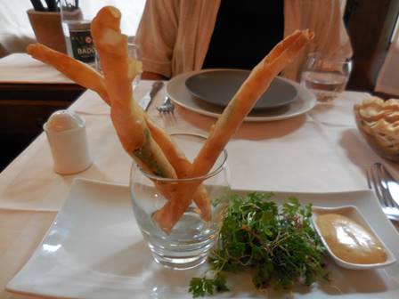 Our shared starter course was a set of three long, thin, piping hot tubes of crispy pastry stuffed with herbs and gently cooked prawns. It came with a curried mayonnaise that was just the right touch.