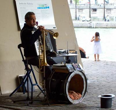 Today is a big holiday in France: the Feast of the Assumption. We’ve been told that not very many people in France are very religious anymore. We’ve heard it said that not many go to church much. That may be, but lately we’ve noticed the plethora of church services held throughout the week, and we’ve seen crowds emerge from evening mass on a couple occasions. Many see the Feast of the Assumption on August 15 as a sort of milestone holiday – it marks the dead center of the vacation period. After today, Parisians will start to come home. Shops and restaurants that were closed will start to reopen. The “rentrée,” or “re-entry” will begin, and suddenly, by somewhere around August 25, the new season begins, almost as if it were a new year. The Assumption was certainly an important milestone for the Virgin Mary: the day that she was “bodily taken up into heaven at the end of her earthly life.” I believe this holiday is very important in the Catholic Church, but as Protestants, Tom and I never were raised to think much about it as a holiday or to celebrate it with a feast. The one Protestant denomination that does celebrate the Assumption is the Anglican church; but we were raised as Methodists. In the Catholic church, this holiday is a “Holy Day of Obligation,” which those of you who are Catholic know means those of that faith are obliged to attend Mass on this day. Not being Catholic, we won’t be attending Mass, but yesterday we discovered another one of the relatively fewer Protestant churches in Paris. We already knew about the Korean Presbyterian church around the corner from the end of the rue du Theatre, on the rue Quinault. I think it is a sort of mission church, and its building was formerly an Evangelical Lutheran Church. Before we started our walk yesterday, I noticed on the newly published map that on rue Fondary, also near the rue du Theatre, was supposed to be a synagogue. We’d never noticed that on our walks, so we made rue Fondary our route to the Seine. It is probably the most direct route. We never found the synagogue, but there was another Protestant church near that spot. It is an Assembly of God evangelical church that meets in an apartment building. Farther down the same block, on the other side, is an interesting Catholic church or chapel that I cannot find in the directories. It dates back not too far, but far enough that I think it was originally surrounded by the factories of the 15th, which was in the early 20th century a fairly industrial area. Rue Fondary turns into rue Rouelle, and at the end of it is a lovely neighborhood park, Square Bela Bartok. Did you know that Bela Bartok, who was raised as a Roman Catholic, became an atheist and then converted to Unitarianism? He wrote not only music, but also anti-fascist treatises. For that reason, he had to flee Hungary when it sided with the Nazis. Very reluctantly, Bartok emigrated to the U.S. After he died at age 64, in 1945, in New York City, only ten people attended his funeral! So I’m pleased that there is a lovely park named after him in Paris. He gave us beautiful music. Sunday afternoons always make us think of music. In the winter, of course, Tom’s Island Jazz band plays for the people on Sanibel, in the garden in front of BIG ARTS. On Sunday afternoons in the summer, we wander through Paris along the Seine. If our timing is right, we always stop to listen to Bernard Constant, the amazing one-man jazz band. Now we know one-man bands in Florida, but they rely on electronic gadgetry and pre-recorded or programmed tracks. Not Bernard. Bernard does it all. He plays accordion, trumpet or valve trombone, bass drum, and high-hat cymbals all at once. If he isn’t playing a horn, he’s singing while also playing the accordion and drum set. And he does it all so very well! We listened to him play for quite a while, applauding after each tune. Our applause echos in the covered stone passageway where Bernard plays, at the right-bank foot of the Passerelle Solferino. It makes the two of us sound like twelve people applauding. Bernard likes that. Not many people stop to listen so long, and we are among the few who applaud. Most people are busily moving from the Seine to the Tuileries or vice versa, and if they stop to listen, they only pause for a short time. Lots of people like Bernard’s music, however, because they put coins into the upturned top hat in front of him. When it was nearly 5PM, Bernard stopped. We went over to say hello. He immediately remembered us as the people from Florida. We had a nice chat, and I explained to him that in Winter on Sunday afternoons, Tom’s band plays jazz for free in the park in Florida, and in Summer, we come to listen to him play there by the Seine, in the passageway to the Tuileries. Such symmetry. Bernard liked that. We worry about Bernard because in these past few years, he’s become frail. The last time we saw him before yesterday, it was a chilly day, and he couldn’t play much or well. But yesterday, he was in fine form. His music was amazingly good. Even his voice, as he approaches 80, is wonderful – deep and full. After that nice chat with Bernard, we walked on and made our way to the Place Saint Germain des Pres, where we hoped we might find the Dixieland band that often performs there on Sunday afternoons/evenings. But they must be away on vacation. That was a long walk, we decided, and it was time to take the metro home to rest before dinner. For dinner we wanted just something very simple, which we found at Le Commerce Café. Charles was our server, but he was more subdued and less silly this time. There were no shenanigans with the credit card machine this time. This was just a simple brasserie dinner of grilled meat – steak for Tom, and duck breast slices for me. Each came with an enormous side – mashed potatoes for me, pasta for Tom. But I ate pasta, and only a fraction of what was served, and Tom ate the potatoes. Again, he
