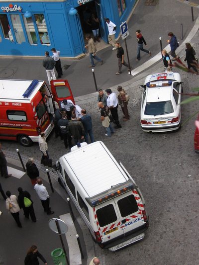 ambulance and two police vehicles blocking the rue du Commerce, but not the