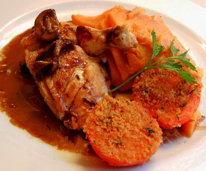 de volaille fermière rôtie, crème forestière, opéra de patates douces, at Le Café du Commerce. |