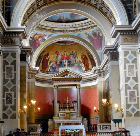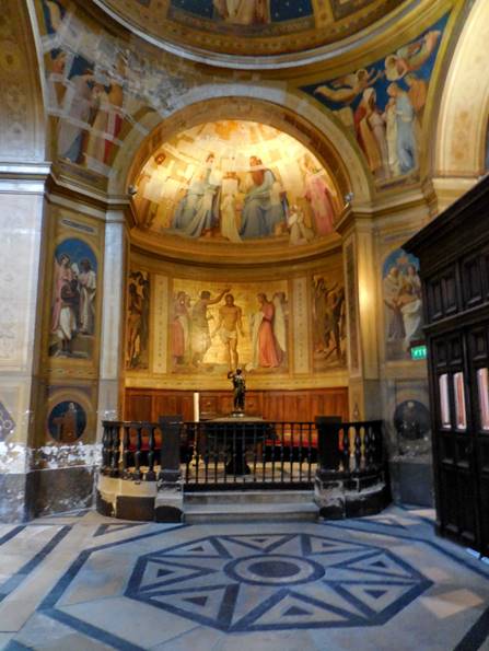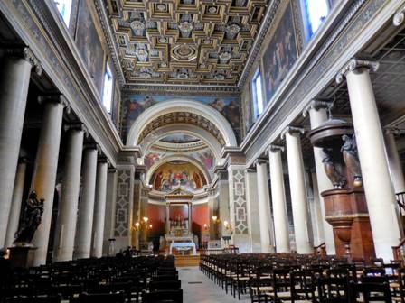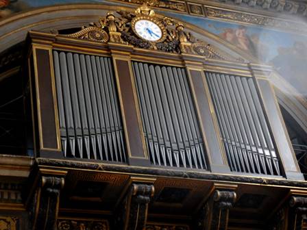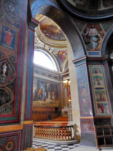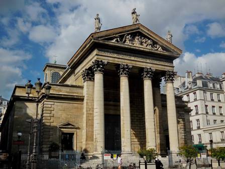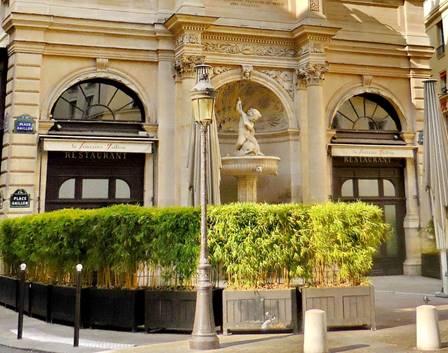 “You know where I want to go?” Tom asked, enthusiastically. “Montmartre,” I said. I guessed right the first time. Tom remembers our earlier visits to Montmartre, 12 to 18 years ago. I tend to remember the more recent ones. We were itching for a good, very long walk, so even if we didn’t stay long on Montmartre, we could walk home from there, we reasoned. We bought another set of metro tickets at the Avenue Emile Zola station and then we were on our way: the line 10 to Invalides, then the line 12 to Lamarck-Caulincourt. Long ago, we learned not to exit at Abbesses, where tout le monde goes when taking the metro to Montmartre. The exit at Lamarck-Caulincourt provides a quieter, leafier, more romantic approach to the peak. The climb is just as steep, either way (Abbesses or Lamarck). Some people take the funiculaire (cable car) after exiting the Abbesses metro station, but we like the climb and we like to avoid crowds. We climbed the stairways of the shady Place Constantin Pecqueur and turned onto the rue Saint Vincent. So far, so good. This was the Montmartre of the good old days. We turned onto the rue des Saules, and while the vineyard and the Lapin Agile cabaret were still there, looking quaint, we began to sense change. Two very long tourist trolleys made up to look like choo-choo trains came tooting down the rue des Saules. Is this an amusement park, we wondered? Has Disney transformed Montmartre? As we climbed up the cobblestoned rue des Saules, away from the Lapin Agile and the vineyard, we saw mobs of people coming towards us. Did a couple of large tourist buses just unload, we wondered? As we reached the rue Saint-Rustique and turned to our left, we realized the awful truth: Montmartre was more crowded than ever – much more crowded than we’ve ever seen it – and we’ve seen some big mobs of tourists there. We could hardly move on the rue Saint-Rustique, and the Place du Tertre had to be even worse. Fortunately, we didn’t want to see the Place du Tertre; we really just wanted to see the sweeping view of Paris from the top of the hill, in front of the Sacre Cœur church. We worked our way through the crowd, somehow found a place along the fence, and took in that view. On the edge of the crowd on the steps below, we saw an amazing acrobat entertaining the masses by performing impossible-looking, gravity-defying moves on one of the tall street lamps. As soon as we could, we exited the Parvis du Sacre Cœur by taking the steps down the hill, leading to the rue Maurice Utrillo. At the intersection with rue Paul Albert, there are some sweet cafés on a cobblestoned place. We saw a fine cat dining with a middle-aged couple at a table on one of the café terraces. The cat was sitting up straight in his chair, waiting politely for morsels to be doled out. After that, we were ready to leave Montmartre. I navigated us around the mobs of people by taking the rue de Seveste past the marketplace and down to the Boulevard de Rochouart, then down through the streets that slice through the middle of the 9th arrondissement (rue Rodier, rue Milton). Then we saw the back of a church. We knew we wanted to go inside, as long as there was no service taking place. It was the Feast of the Assumption, after all. When we walked around to the front door, we realized this was Notre Dame de Lorette, and it was open but quiet. We entered. What an incredibly beautiful church! We’d seen it many years ago, and it had faded from my memory somewhat. What a blessing to see it again, and to be reminded of its quiet splendor. Notre Dame de Lorette is a neo-classical church, constructed in the early 19th century to replace a chapel that was destroyed in the Revolution. Well-known people were baptized there, including the musician Georges Bizet in 1840, and the artist Claude Monet in 1841. Notre Dame de Lorette’s architect was Louis-Hippolyte Lebas (1782-1867). When Lebas was an assistant to Pierre Francois Leonard Fontaine, he oversaw the construction of the Chapelle Expiatoire – another one of my favorite spots in Paris (built on a site that was a mass grave for guillotine victims, including Louis XVI and Marie Antoinette, until their remains were moved to the Basilica of Saint Denis). After a lovely, soothing visit, we continued downhill, down the rue Lafitte and into the 2nd arrondissement. I asked Tom if he wanted to see Place Vendome again, and he eagerly said “YES!” So we turned on the rue Saint Augustin. At the Place Gaillon, we happened upon a sight we’d completely forgotten: the Fontaine Gaillon, with its oversize and elegant fountain and semi-formal restaurant terrace (below). The restaurant was closed.