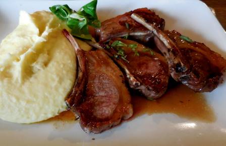 At the rue Casanova, we turned right. We were ready to see the Place Vendome, but we were thirsty and hungry. Just at the right moment, we saw one of the bigger Eric Kayser bakeries. This one had a deli counter, tables and chairs. So we bought a slice of country terrine, a baguette monge (Kayser’s version of the baguette de tradition), and two bottles of Saint Pellegrino sparkling water. It was the perfect snack because we could eat just a few bites to stave off the hunger pangs, and not spoil our appetite for dinner. The rest we could take home, and we did. We’d skipped lunch, as we often do. After a couple hours of walking, we were quite hungry. Refreshed, we continued on around the corner, onto the Place Vendome. The tall column in the middle was completely covered by scaffolding and canvas; it is being restored. At the rue de Rivoli, we had to make our way through another mob that was thick enough to extend into the Tuileries for some distance. After we crossed the Seine on the passerelle leading to rue Solferino, the crowds weren’t so bad. We walked up the Berges de Seine, which were busy but not mobbed, until we realized that we might be late for dinner. At the Pont Alexandre III, we climbed back up to the street level to make our way over toward the Invalides metro station. We were footsore, and pressed for time. As we wound around the Air France building, we noticed a sleek, shiny black taxicab with its green light shining on top. It was waiting at the curb, right next to a bus stop. Tom said, “You know, we could take a taxi.” What a novel idea! And so we did. The fare was only 6.90, and the metro tickets for two cost over 3 anyway, so it was only an additional 3 or 4 euros, with rapid, to-the-door service. Often, the taxi would be too slow because of traffic. But we knew these streets, and particularly on weekends, we knew there’d be little traffic. We’ll do this more often. Taxicabs in Paris are good. So we did have a half hour to relax and dress up before dinner, which was at Le Pere Claude, on the avenue de la Motte Picquet, near the École Militaire. I wanted a really good, traditional French bistrot for our holiday dinner, and Pere Claude fit the bill. We skipped the starter courses. Tom ordered the tender, juicy, grilled lamb chops, which came with a generous serving of heavenly puréed potatoes.
