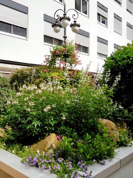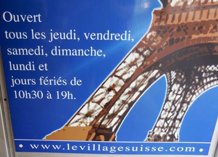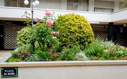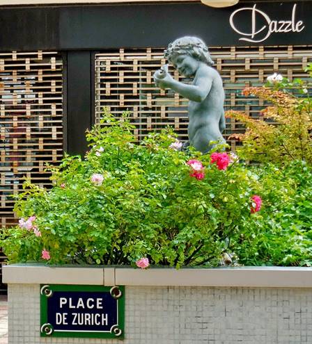 We frequently take a “shortcut” through the Village Suisse on our walks to and from the Champ de Mars. The route isn’t really shorter, but it is quieter; it allows us to skip the busy intersection of the avenues de La Motte-Picquet and Suffren. Usually, the shops of the Village Suisse are closed when we walk through there. Still, we enjoy the beautiful flowerbeds and the window shopping. And it is always nice to get away from automobile traffic. The architecture of the Village Suisse is an anomaly in this upper reach of the 15th arrondissement. It is a modern housing block designed and built in the 1970s, but it has a nice network of courtyards, one opening onto the next. The courtyards are graced with large planters filled with flowerbeds and some statues.