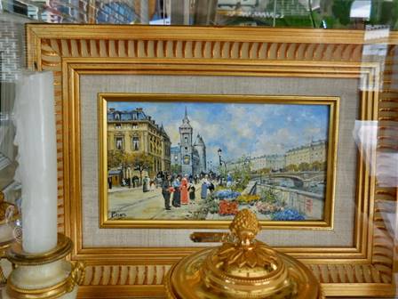 The land was available for development in the 1970s because of its historic use in the Paris Universal Exposition of 1900. At the earlier Swiss national exposition in 1896, the “Suisse village” exhibition had been a hit. So it was decided to bring that “village” to Paris for the even bigger fair of 1900. While most of the Paris 1900 exposition was in the 7th arrondissement – particularly the Champ de Mars – the Village Suisse and the Grand Roue (huge ferris wheel) were placed in the adjacent 15th arrondissement, just across the avenue de Suffren, and very close to the École Militaire. (Click here for some charming images and film clips showing the Village Suisse exhibition at Paris 1900.) All expositions like this are temporary, so the Grand Roue and Swiss village were gradually dismantled after the show ended. Then rag pickers (chiffoniers) used some of the passenger gondolas from the Ferris wheel as vendors’ stalls to sell their “wares.” Eventually, the chiffoniers were replaced by brocanteurs (bric-a-brac and used furniture vendors). Other passenger gondolas from the old Ferris wheel were used as homes for French families following the devastation of World War I. When the area was redeveloped as modern housing in the 1970s, the little businesses were reinstalled as shops in the ground floor of the new complex. The developer retained the name “Village Suisse” and named the interior courtyards after well-known places in Switzerland. But of course, the complex does not look at all like a Swiss village. The current shops are many notches above those of chiffoniers or brocanteurs. These are now fine art and antique galleries, jewelers, clockmakers, and oriental carpet vendors – over a hundred of them. The installation of the art and antique galleries across from the Louvre on the rue de Rivoli only increased interest in the Village Suisse. Those shoppers who cannot find what they want at the grands antiquaires of the Louvre move on to the Village Suisse in their continuing quest. We wandered through the Village Suisse yesterday, even though the shops are generally closed on Tuesdays and Wednesdays. August is the month when many of the shopkeepers close for vacation. So the place was quiet yesterday. Only a couple shopkeepers were hanging around, and one of them sat cross-legged on the floor as he tediously repaired an oriental carpet.