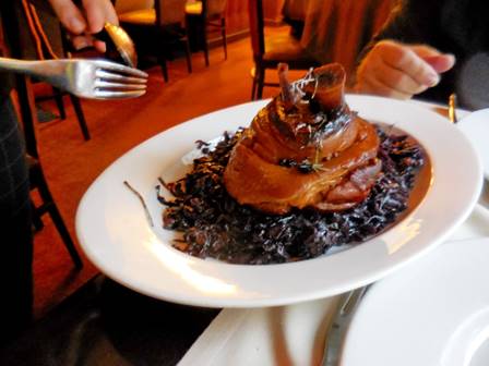 The cool, steady rain continued through the day and all through the evening yesterday. Fortunately, our dinner reservation was only five or six blocks away, at the Restaurant Stephane Martin. We’ve been dining at Stephane Martin’s for many years. This year, we didn’t manage to dine there before the resto closed for vacation. But a couple weeks ago, I made the reservation for yesterday evening, which was just a couple days after the re-opening. The timing was especially good because the big specialty of the house is a pork roast for two – something we’d only want to indulge in on a chilly evening. The roast, called a jarret de porc, is pretty much the same cut that I use to make pulled pork (Boston butt roast), without the outer layer of fat removed. It is served with a red cabbage that has been slow-cooked in red wine and honey. The dish is a traditional Alsatian preparation. The server said this roast had been cooked for an entire day. I only cook my jarret pork roast for about nine hours, I told her. Although I usually do pulled pork (for Tom’s poker buddies or for a family barbeque), I have prepared this exact same Alsatian jarret de porc dish, with the red cabbage and all, at least once in the past. I just duplicated the Stephane Martin roast based on taste and memory. I always look forward to cooking in my own kitchen when we return from Paris. The server acknowledged that the dish is so copious that it is okay to take some home with us after dinner. Tom did not understand her, so I repeated back to her, in French, “It’s okay to take away after dinner?” She confirmed it, even using the term “doggy bag.”