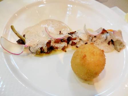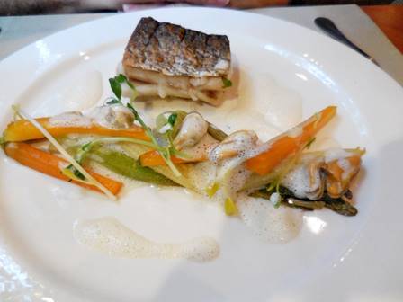 Tom ordered the fish this time: pave de haut bar grille sur la peau, coquillages et legumes braisés. This sea bass arrived with a few mussels – all extraordinarily good.