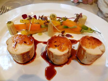 My main course was ballotine de poulet jaune fermier, legumes de printemps nacrés au jus caramelisé – medallions of top-grade chicken, with spring vegetables and a caramelized juice sauce. Very nice. The chicken was flavorful, juicy and tender.