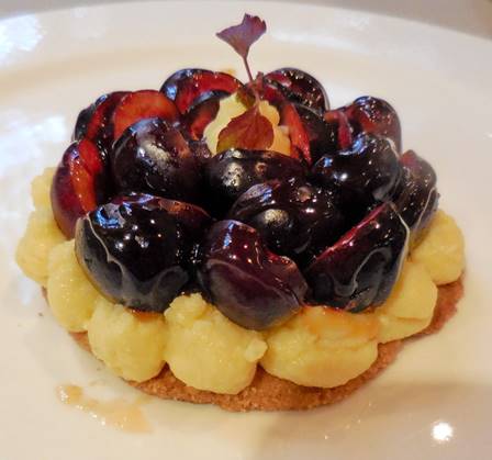 Tom was planning to order the profiteroles again for dessert, but I talked him into sharing a cherry tart with me instead. Its crust was a sablé – a cookie-like disk – and the marinated cherries sat on a bed of vanilla cream pudding. A heavenly dessert. Cherries have been particularly good this season in Europe.