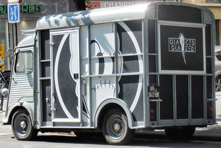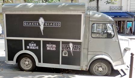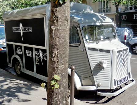 Hot. Yesterday afternoon was hot. Very hot. 94 degrees F. I knew it would be, so we implemented heat abatement procedures in the apartment. Inside the apartment, my feet were actually cold in the afternoon. We’d gone for a walk in the morning, through the neighborhoods on either side of the Champ de Mars. Other than when we crossed the Champ, we saw few other people. The Champ de Mars is always a busy place, however. I was tickled to see one of those antique Citroën trucks all decked out as an ice cream vendor, parked on the avenue Suffren. Something about funky old Citroëns makes them so cute. By the end of our walk, the air was getting heavier, and we could feel the heat starting to close in. We left our cool building again in the evening. The heat felt like a warm blanket, almost smothering us. We walked slowly down the shady avenue Emile Zola. We stopped in the nice pharmacy at the Place Charles Michel because Tom needed something there. The shop was well air-conditioned. We were very warm again by the time we reached our goal, the restaurant Le Pari --, a lovely, well-capitalized and well-air-conditioned establishment. The food at Le Pario is creative and beautifully presented. We were given a mis en bouche of a cool fennel cream soup topped with slivers of cashews. Delicious. Our starter course was a fricassé de girolles et artichauts violets, oeuf poule cuit mollet, emulsion aux morilles – a fricasee of girolle mushrooms and violet artichokes, with a softly cooked egg and an emulsion made from morel mushrooms (below). The egg was encrusted with breadcrumbs. Very interesting and good.
