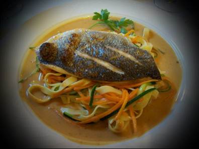 It’s back! The green algae is back! No, I’m not talking about home in southwest Florida. I’m talking about here, in France. Specifically, in Brittany. I’ve written about it in prior years, when the toxic fumes from the massive amounts of algae rotting on the beaches killed a horse, and possibly a jogger years ago. And in 2009 it probably killed Thierry Morfoisse, whose job it was to collect and remove the algae. This year, the algae started up earlier. Usually it begins to accumulate on the beaches in July, or June at the earliest. This year, with the unusually hot Spring weather, it started earlier. So it has been rotting longer, and now has killed, so far this season, no fewer than 36 wild boars, one muskrat, and one badger – all since July 7, and all on the beach at Saint-Maurice de Morieux. A large amount of money is spent removing the algae from the beaches of Brittany, but as those of us in southwest Florida know, it is a mammoth job and it is impossible to get it all, all the time. Tide takes it out, and brings it back in again. The situation is out of control in Brittany. Now local people are starting to worry that a child who briefly escapes the watchful eye of his parents could be killed – by the hydrogen sulfide fumes that the rotting algae emits. That stuff stinks to high heaven, so I’m not sure why anyone would want to be anywhere near that beach. But kids will be kids, I guess. Real estate values of the near beach homes have plummeted. Both the environmental and the agricultural research institutes agree that the hydrogen sulfide fumes from the algae are what killed these animals. But the prefecture of police for the Côtes d’Armor region isn’t 100 percent on board, because the autopsies show that one of the wild boars didn’t have any hydrogen sulfide in his lung tissue. Could it be that he just died of a broken heart? The water and rivers association for Brittany wants all the beaches where the algae is not removed daily to be closed. As of July 18, 32,000 cubic meters of algae had been removed this season. This is 4,000 cubic meters more than last year. Two area organizations retained an attorney who, on Friday, filed a claim against the government of France for “putting in danger the life of another,” due to the government’s lack of effectively addressing this huge environmental problem. The problem first started showing up in the very early 1970s, so this isn’t new. Forty years of discussions about it haven’t yielded an effective solution. The cause is an intensification of agricultural practices, especially with livestock, that started back in the 1970s in order to increase production and lower costs of food. In July 1971, the green algae problem in Saint-Michel-en-Grève in the Côtes d’Armor caused the city council to ask the French government for help. So the government did a study, determining that each year more than 200,000 tons of green algae are produced, part of which ends up on the beaches in about 109 places in Brittany and some other places to the south, up to the Île d’Oleron and in Normandy. Like all green plants, Le Parisien explains, green algae gobbles up the vegetable and animal waste, and has grown at the same pace as the intensification of agriculture in the region. Brittany has the distinction of having half of the livestock in France, according to Benoit Hartman, spokesperson for France Nature Environment. Nitrogen (called azote in French) that comes from agricultural sources accounts for 98 percent of the nitrogen consumed by the green algae, says Jean-Louis Peyraud, the scientific director of France’s National Institute for Agronomy Research (INRA) in Rennes. He says that 75,000 tons of nitrogen is in the rivers of Brittany, which flow into the estuaries. Benoit Hartman says that the only solution is for those who raise livestock to completely change their system. Yet, he says, “we demand the farmers to produce more, and to do it less expensively – the agricultural agents don’t have any interest in cooperating when the cost of cleaning up the green algae is paid for by the French government, the regional and local governments, and the taxpayers.” Nitrogen doesn’t sound so appealing to us, so we gobble up French food instead. Last night, I selected La Gitane for our dining adventure. I am starting to adore this place owned by Olivier and Corinne Mayeras, former journalists. Corinne greeted us, and she looked happy to see us. She allowed us to select whatever table we wanted. I asked for one in the rear of the dining room, because we had not yet dined there. I appreciated my seat particularly because I could watch the entire restaurant in the mirror on the wall ahead of me. We like to watch and analyze the operations of restaurants that we admire. This one, La Gitane, is run with precision, grace, warmth, and good taste. I ordered the Dorade (sea bream), one of my favorite fishes, which for some reason I had not yet had this season. Tom ordered the lamb brochettes, Niçoise style – the special of the day. My Dorade could not have been better. It was perfectly cooked, and was served on a pile of delicious tagliatelle pasta mixed with delightful, finely julienned vegetables. It all rested on a pool of a lovely, savory light-brown sauce that was called crème de tomates. Tom’s lamb brochettes were delicious, and they came with a ratatouille shaped into the size of a tartelette. The dessert special for the day sounded tantalizing – a raspberry tartelette, with pistachios. So we each ordered one. The raspberries were not sweetened, and so they exploded with flavor in our mouths. They rested on a layer of lightly sweetened pistachios ground into a paste – all inside a homemade crust that makes you think of Grandma’s best pies. We finished with a cup of espresso for Tom, and calvados for me. I think La Gitane has become our new favorite restaurant in Paris. Sign