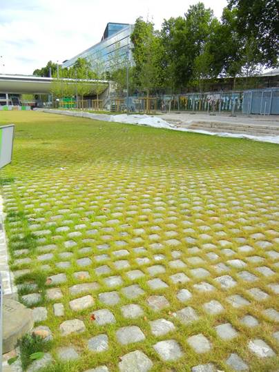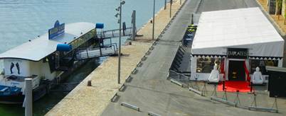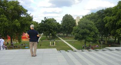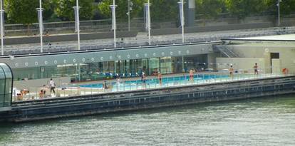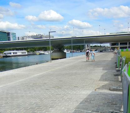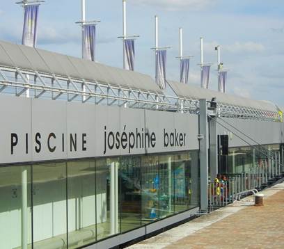 We’ve grown accustomed to thinking of Sunday as the day for our grandest walks along the Seine. That’s because the highways along the river are closed to automobile traffic on that heavenly day. But with all the changes that the Delanoë administration has been making, and is continuing to make, the grandest walks along the Seine are slowly becoming available to us just about any day of the week, weather permitting. I’ve often wondered what would happen if one would combine the efforts of Bertrand Delanoë (the mayor of Paris), and my friend Darla Letourneau, of the BikeWalkLee organization in southwest Florida. That would be the happiest collaboration imaginable for pedestrians and cyclists. Yesterday, we took the metro’s line 10 out to its farthest point east, the Gare Austerlitz. We exited the station, turned the corner and voila, there is the Seine. When we walked from that point eastward last year, we were in a great construction zone, where the highway was being ripped up and was about to be replaced by pavers and pedestrian amenities. Yesterday, we found that this place is still a construction zone, but the project is nearing completion. The walking was so easy there, especially because it was Saturday, and no construction workers were present. In an area called Les Docks, the nearby buildings are being improved along with the riverfront. One formerly very ugly building that was plagued by a really seedy riverbank beneath it is now a trendy-looking school for business management, fashion and design. Young people were lounging at tables and chairs on a deck above us as we walked by; a DJ was setting up equipment near them. Party time at the school of design was approaching. As we reached the end of the construction zone, we were entering a stretch that had been renovated not that many years earlier. In the past few years, this had been made part of the Paris Plage (Paris Beach) summertime event. But this year, it just is what it is – a nice, pedestrianized stretch of riverbank with café/club barges/boats and outdoor terrasses for drinking, sunning, and relaxing. Why spend Paris Plage money here, where it is already like the beach in so many ways? It was like bringing coals to Newcastle. So this year, no Paris Plage here in the 13th. But it doesn’t make much difference. Who needs sand when you have such beautiful granite pavers? Most of the newer pavers in this long stretch of the left bank are smooth and flat – much easier to walk on than the old cobblestones. But here and there, we encountered sections with old cobblestones that had been dug up and then re-installed. My favorite areas we saw early on in our walk, in the construction zone, where pavers are spaced just so that a bit of grass can grow between them. The grass has been planted and is starting to grow now. The effect is pleasing, as long as the grass is trimmed from time to time. We passed under the Pont de Bercy, which is very like the Pont de Bir-Hakeim over in the 15th arrondissement. These two bridges are multi-level; a train uses the upper level, and the main level is for cars and pedestrians. The main level is an arcade of arches decorated by hanging lamps. The architecture is romantic. I know that the Bir-Hakeim bridge has been used in movie scenes; the Pont de Bercy probably has been, too. Between the Pont de Bercy and the pedestrian bridge called the Passarelle Simone de Beauvoir are several long boats. A few are cafés/clubs, but one barge is the relatively new Piscine Josephine Baker – a floating municipal swimming pool “Piscine” is one French word that I dislike. It sounds like what you should not do in a swimming pool. Pools are important to me. When I’m in Florida, 9 months of the year, I am a long-distance swimmer; I swim 6,000 feet per day. That’s well over a mile. I recently figured out that if I add a few more lengths to that swim, it will be an even 2 kilometers. That’s what I plan to start doing in October, when we return. I’m spoiled by the swimming pools available to me in Florida, and therefore I do not swim in the municipal pools in Paris. Most Paris pools are indoors, and that is not appealing to me. The Piscine Joséphine Baker comes close to being a pool I’d swim in, but it is too crowded with other swimmers and kids playing. That just doesn’t work out for a serious swimmer like me. And that’s okay; a break from long-distance swimming for a few months a year is not a bad thing for the body. Still, it was fun to see the Piscine Joséphine Baker, and to think about this long tradition in Paris. You see, there was a pool on the left bank as long ago as 1785. Back then, the facility was called “baths,” and it was named La Deligny. The original baths were built on stilts. Later, I think in the 20th Century, La Deligny became a floating pool, on a barge, as the Piscine Josephine Baker is now. La Deligny was near the National Assembly building, which is like the French version of our U.S. House of Representatives. Only the representatives are called “deputies” in France. The original baths at La Deligny became a swimming school in the 19th century. Other amenities were added, such as a bar. The 20th century brought topless sunbathing to La Deligny. That bothered some of the deputies in the nearby National Assembly. So the facility’s manager designated one area only for topless sunbathing, and children, for some reason, were not allowed in that area. Wouldn’t it have been easier and more logical just to ban adult men from that area? La Deligny drowned, sinking in the summer of 1993. The Piscine Joséphine Baker is considered to be its replacement. Tom and I walked up the cobblestone ramp to the Passarelle Simone de Beauvoir. This relatively new pedestrian bridge, already famous for its architecture and its peculiar vibrations, is now starting to attract lovers’ padlocks, just as the Passarelle des Arts has done. The Simone de Beauvoir pedestrian bridge 