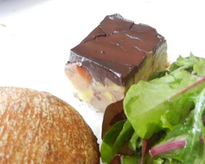 lacquered in dark chocolate, served with a delicious little green salad and a