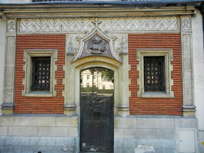 As we were strolling down the boulevard de la Tour Maubourg, something stopped us dead in our tracks: a strange façade on a small storefront, on an otherwise normal, handsome Haussmannian apartment building at number 82. It had those fine, thinner bricks with stone coining, two small stained/leaded glass windows with iron grills, and old wood double door protected by an outer glass door. Above the brick was some decorative stonework that included what I thought was a hairy pig but Tom thought was more likely a porcupine, with a crown hovering over it. Very weird. I pulled out the camera and began to photograph it. A woman wearing a tourist-like knapsack came up and also pulled out her camera. She started to address us in French, but then when she heard us speaking to each other, she switched to English. An American, she was. She asked if we knew what this place was. I said no, I had no idea. But I knew I’d be able to find out – on the internet, this morning. First, I found a piece about the façade in a web site for the history of the 7th arrondissement. Tom was right; the animal in the symbol is a porcupine. The emblem is that of an order of knights. L’Ordre du Porc-Épic