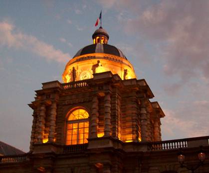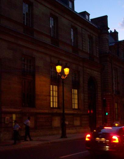 The rue de Vaugirard by the Luxembourg Palace at night. Notice the guards on duty, making this a