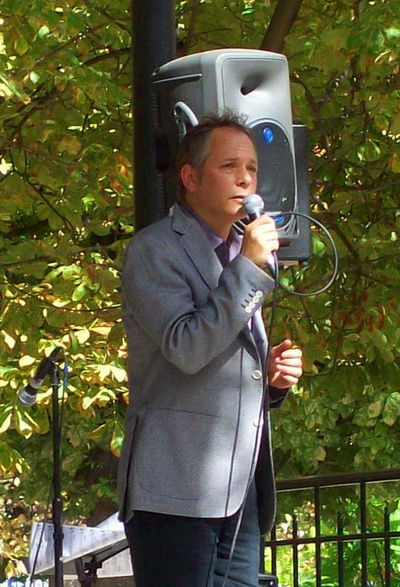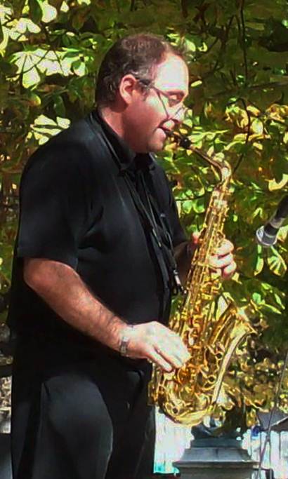 saxophone player, Jean-Yves Prat, in Big Band Jazzique System, a French big band. Below, the band’s American vocalist, Joshua