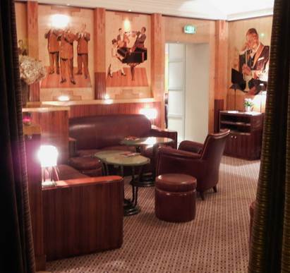 lounge at the Hotel Lenox, with its fascinating inlaid wood jazz scene panels