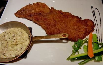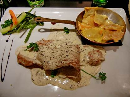 scaloppini with black truffle sauce, ravioli, and sautéed vegetables. Scaloppa Milanese,
