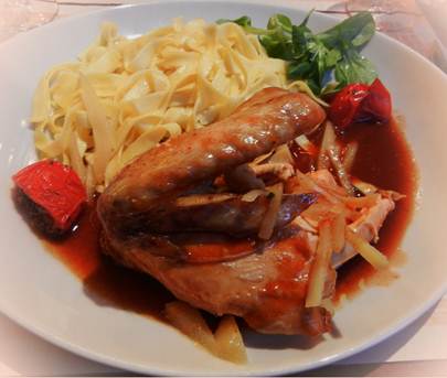 chicken in a fabulous sauce featuring shards of fresh ginger. Tom’s
