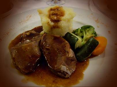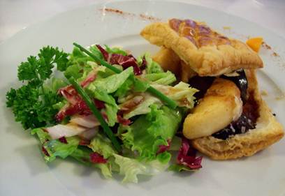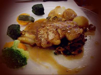 soufflé s, as well as a few other veggies and little roasted potato slices. (Cote de veau sur gateau de champignons.)