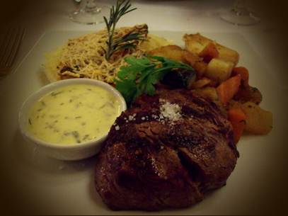 Chateaubriand steak, sprinkled with sea salt, served with Béarnaise sauce,