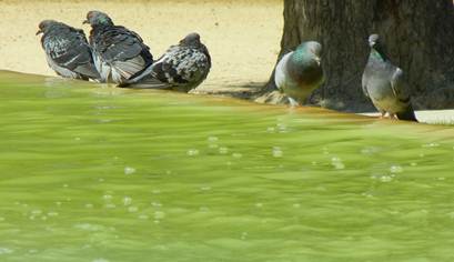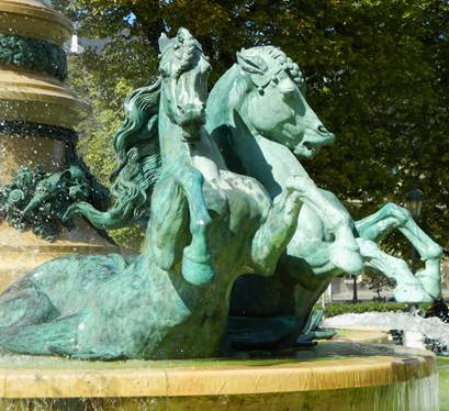 horses and real pigeons enjoying the Four Corners of the Earth fountain. Calamari