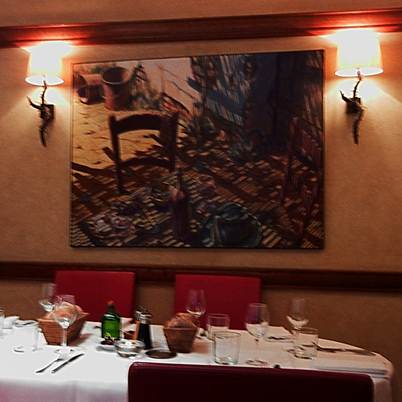included lovely tasting herbs, but required addition of salt and pepper. The name of this dish was penne à l’encre de seiche, calamars aux trois poivrons et roquette. Tom had a gigotin d’agneau poêlé au serpolet, polenta et légumes verts, small chunks of leg of lamb, braised with thyme and served with vegetables and polenta. Dessert for Tom was a millefeuille traditionnel « fait minute » à la vanille Bourbon – a tall stack of homemade, flaky pastry with a layer of vanilla-bourbon creamy pudding in the middle. Oh so French! For the first time, we were seated at a corner table in an upstairs dining room at La Bastide Odéon. I’m not sure if we even knew the upstairs existed before last night. The upstairs has two parts; on the other side of a wall was another upstairs dining room in which one large, English-speaking group was being served. They all were having the same courses, so it must have been some pre-arranged deal. The group appeared to be co-workers and spouses, or perhaps academics. We had reserved via lafourchette.com again, resulting in a 20 percent reduction on the food part of our bill. That was the reason I was willing to go there again, even though in the past I thought it was overpriced for what it was. But last night’s dinner was so good that I think I’d go back again even at full price. Our total bill, with sparkling water and two glasses of wine, was 59 euros (with the 12-euro reduction factored in), tax and tip included. We did, however, leave an additional 3 euros as a pourboire (small additional tip), because the service was so good. Thank you, lafourchette.com, for getting us to go back to La Bastide Odéon. |