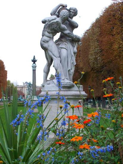 That lead photo in yesterday’s journal did not receive the appropriate amount of attention in this journal. Of all of the statues in the Luxembourg Gardens and the two gardens to the south of it, this is one of the best, in my opinion. It is called Le Jour (The Day) and was created by Jean-Joseph Perraud in 1875. This statue, unlike many, is really marble (not cast concrete). The carving – the musculature, the fabric, the composition, the sense of motion – make it wonderful. Daniel Cady Eaton, the author of Modern French Sculpture, says that “during the Second Empire no sculptor enjoyed a greater reputation” than Perraud. I can see why. He was born in the Jura, a mountainous department of France, in 1819. When he was 15, he was apprenticed to an ébéniste (a maker of fine furniture, often the elaborate wood-inlay that the French are known for) and ornemaniste (ornamental artist). The young Perraud’s talent was recognized, and he wound up studying at the École des Beaux Arts in Paris. His work won honors and awards. He worked for the Medici family in Italy for a while, then returned to France. In 1865, he became a member of the Institut de France, which ensured that he had commissions until the end of his life. Some of his most famous pieces include the Childhood of Bacchus which is now at the Louvre, and the Lyrical Drama, which decorates the exterior of the Palais Garnier, the beautiful old opera theater in Paris. He died in 1876, and is buried in the Montparnasse cemetery. After walking by Perraud’s Le Jour, we went on down to the great “Four Corners of the Earth” fountain at the end of the Marco Polo Garden, puzzling over why it isn’t operating and why so much leaf and other litter has been allowed to accumulate in its stagnant pool. I suspect the workers are making a point about budget cuts, letting this become an eyesore so that people will complain to their public officials about it. It is such a gorgeous fountain; this is a shame. After walking back up through all three parks, we decided to visit the stately semi-circular square in front of the Odéon Theatre. That space is an architectural masterpiece. “Romeo and Juliet” is being played at the theatre now; but unfortunately, it is a translation that is being performed. It just doesn’t seem that it can really be Shakespeare unless it is performed in English. On the spot, Tom translated some famous lines from the play into French, and we both could hear that it just isn’t the same; it doesn’t sound right at all. Anyway, I’m glad that the French think highly enough of Shakespeare to produce “Romeo and Juliet” in one of the National Theatres. In the book I’m reading now, the Irish author speculates about why the French frequently use English words in the names of shops. In the example she used, a laundromat in Paris is called the “Wash Shop.” She thinks the French do this as a way of adding class or status to the name of the business. Tom pointed out that we do the same thing in reverse; we use French words in the names of shops in order to make them sound classier. Isn’t that interesting? After marveling at the Odéon plaza and deciding that seeing “Romeo and Juliet” in French was probably not a good idea for us, we walked on over to the Saint Sulpice church. I noticed before we entered that in about an hour and a quarter, a concert of Mozart’s Requiem would begin there. We went inside anyway, and simply sat for a little while and listened to the orchestra receiving some verbal instructions. Then we went over to admire the Delacroix paintings near the other entrance, and exited by the table set up for concert ticket sales. We sat on a park bench out on the lovely square in front of the church and talked about where to go for dinner. After discussing several possibilities, I suggested the Café Tournon. Tom was delighted. He said, “Now, why didn’t I think of that?” The Café Tournon is turning out to be our “neighborhood pub” while we are in the 6th, but it really is not a pub or mere brasserie. It is a café, or bistro, I’d say. One of the specials of the day was a turbot meunière, which I could not resist. Another special was the onglet de boeuf, and Tom, steak-lover that he is, ordered that. We finished by sharing another daily special, a little pain perdu topped by a peach compote. It was an excellent dinner. We sat across the dining room from the door into the little kitchen. I watched the chef work. He did everything with ease, and the results were delicious. But somehow, the chef looked sad. I wonder why. Our server was not sad. He was positively ebullient. When I told him that the turbot was excellent, he launched into a little enthusiastic speech about turbot, and what is unique and interesting about it. Clearly, this server is interested in food. The server was very fay, too. That, combined with his natural ebullience, made him cute. Quite cute. The turbot was an interesting choice for a meunière treatment. Usually, as with sole meunière, the fish served this way is soft and delicate. But turbot is very firm, and has large bones. Several times, I saw our server hanging on the sill of the open window into the kitchen, watching the chef attentively as he waited for the finishing touches to be put on a dish. Then he carried the dish immediately to the proper table. No food was going to get cold under his watch! The other server also came by to ask if all was going well with our dinner, and we assured him that it was. When we left, both servers and the bartender said goodbye and thanked us. I adore all this warmth and friendliness. Coming home, we noticed that the small restaurant on the corner near the apartment was very busy. We’ll have to dine there soon. Sign