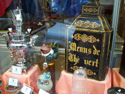off of one of the shopping arcades, and below, a tea shop’s window.