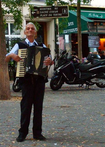 We entered the shopping mall part of the Saint Germain market and music filled our ears. A horn was playing Antônio Carlos Jobim’s “Corcovado” (“Quiet Nights of Quiet Stars”). We found the source: a man playing French horn! He was taking advantage of the good acoustics in the marble-lined halls of the shopping mall portion of the market. We were his only audience. We listened with great pleasure to “Corcovado,” then he played “Autumn Leaves.” We applauded both times. He smiled in appreciation. Tom gave him a euro or two while I asked him, in French, what the name for a French horn is in French. He said it is a cor d’harmonie. I remarked, in French, that it is unique for jazz. He smiled and agreed. One doesn’t often hear jazz played on a French horn. Soon after we started this long Saturday walk, I realized that the batteries in my camera were dead. Cheap unbrand batteries from Dia, the discount grocery! I should have known better – I should have packed the next pair of cheap batteries as backup. But we were too far along already to turn back to the apartment, so I decided to buy some batteries someplace along the way. The beginning of our walk was through the very crowded, touristy part of the 6th arrondissement, and over the river into the 1st, where we attempted to walk through the cour carré of the Louvre again, but the entire courtyard had been overtaken by the erection of a temporary structure for some upcoming event. Out and around the end of the Louvre we went, skirting the very old Oratoire du Louvre and making our way over to the rue Croix des Petits Champs to reach the Place des Victoires. I’d carefully planned our route to the top of Montmartre so that we’d see as many old-fashioned shopping arcades as possible. The first two of these arcades were off of the Place des Victoires, and in some ways, these are the best in terms of restoration and upkeep. I’m sorry not to have photos of this for you. These arcades, the Galerie Vivienne and the Galerie Colbert, are lovely, and not to be missed on a day that you plan to spend visiting places like the nearby Palais Royal. Yet the best was yet to come. As we were passing the Palais de la Bourse, I glanced off to my left and spotted a Monop on the rue de la Bourse. Perfect! No crowds, and decent prices for batteries, I enthused. I’m becoming a big Monop fan. So when we reached the extensive shopping galleries between the rue St. Marc and the rue du Faubourg Montmartre, I snapped away like the Energizer bunny, with two new batteries in the camera and two Energizer AAs at the ready, as spares. So many cities had nice shopping arcades like this by the end of the 19th century and beginning of the 20th, but most of them are gone forever. Paris has retained many of them. Parisians are so very wise, in so many ways. The shops are charming, and I think there must be some kind of rent control because many of them cannot possibly make a lot of money because they are so specialized. The Passage Jouffroy was our favorite of the day, in part because of our discovery of the Hotel Chopin. It is only a 2-star hotel because it has no elevator and no air conditioning. But it is situated uniquely in this shopping arcade, next to the Musée Grévin (wax museum). When the shops close at night, only the hotel guests can come inside this arcade. None of the rooms open onto a noisy street. The hotel has only 36 rooms, and of course there is a piano in the lobby so somebody can play Chopin if the mood strikes. The best rooms are on the 3rd floor, which is like the 4th floor in American English – a fourth-floor walkup, not for the faint of heart. The room prices are only 96 to 110 euros per night for double occupancy (78 to 86 for a single), and breakfast is only 7 euros. Each room has its own bathroom, not to worry. But I’m sure the rooms are small, as is usually the case in reasonably priced hotels in Paris. The reception was charming and warm. We had a fine chat with the woman at the desk, who warned us that when we decide to come, to reserve well in advance. The hotel books up, and I can see why. Finally we left the last shopping arcade of the day, exiting on the rue du Faubourg Montmartre. Right away, we turned onto a pedestrianized shopping street, the rue Cadet, which was buzzing with activity on this beautiful weekend day. As we neared the rue Turgot, I was unbelievably famished. I’d had no lunch, we had walked so far, and it was nearly 5PM. But I didn’t want to sit for a long time in a café; I feared that if I did, I wouldn’t want to go on up the hill afterwards. So we popped into a bakery and took advantage of one of those quickie lunch packages they offer. This one was called the “formule quiche,” and it cost only 5 euros. It consisted of a big slice of quiche loaded with chopped vegetables, a generous slice of raspberry-rhubarb crumble, and a bottle of mineral water. Tom bought a big, buttery almond pastry for himself. We continued up to the square with park benches at the intersection of the rue Turgot and rue Rochehouart. We ate some of the treats, but not all. Fortified, we looked up the hill at the top of Sacre Cœur. Onward, we went. At the top of the rue Turgot is the Square d’Anvers, where I knew there would be live music for the Fête des Jardins that is going on this weekend. We sat on a bench with lots of moms and kids all around us, and listened to the Langue du Bois (tongue of wood) group perform French songs and poetry. After a nice little rest, we headed into the touristy throng on the rue de Steinkerque. In addition to the mass of t-shirt and souvenir shops are fabric stores with big bolts of cloth set out on big tables. One store had piles of cheap women’s clothing on big tables on the sidewalk, and a crowd of frenzied women plowed through the piles, each reserving a heap for herself. You won’t see this exciting activity on a Sunday; the stores are closed then. If you’re into th