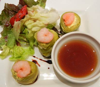 leek leaves stuffed with goat cheese, topped with shrimp, and served with a