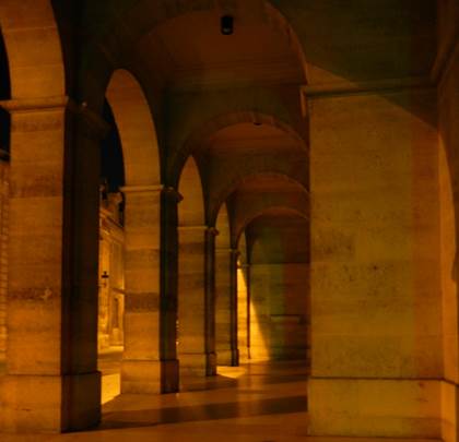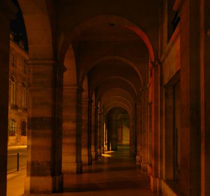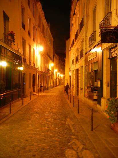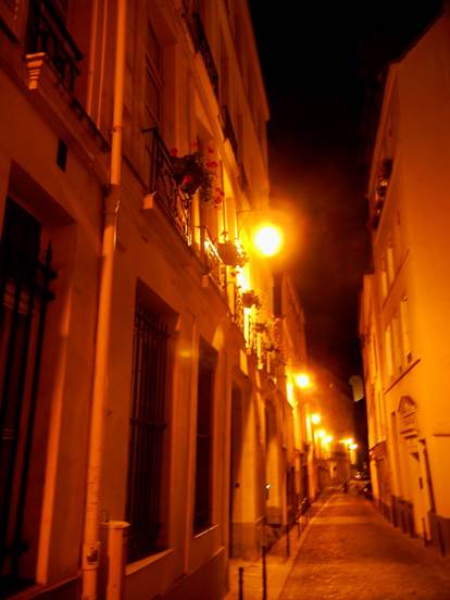 and old part of Paris, the warm sodium vapor lights give a magical glow to