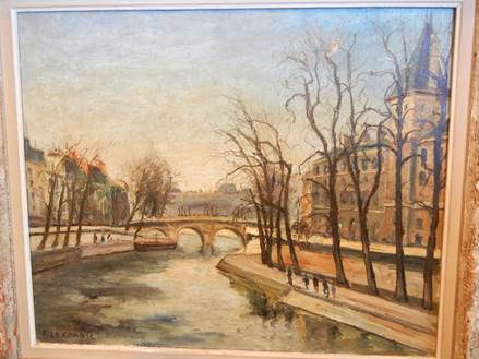 I paused every eight feet or so as we walked down the Pont Saint Michel. I took photos at each interval. “One of these will turn out to be the exact place where Francis LeCoadic painted a wintertime view of the Seine,” I thought. We own the painting. Tom brought it home from the Iona Hope Thrift Shop one day, a month and a half ago. I cleaned it, and brought its colors back to life. Here’s the painting: