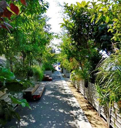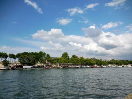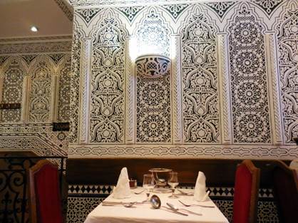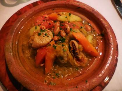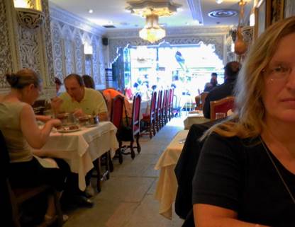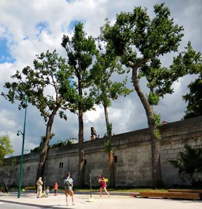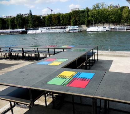 Paris may be in better shape for walking than she’s ever been before. She started on the Les Berges de Seine regime a few years ago, and now she’s fit as a fiddle. Or perhaps, a violin. Make that an entire string section. I’m not talking about her beach thing that she does in July-August every summer. This Berges de Seine regime is something she keeps up year round, and it extends far beyond the “Paris Plages” beach thing. She used to do it only on Sundays; walking the Berges de Seine was a Sunday activity – sort of like those “weekend warriors” who only play touch football on Saturday or Sunday. Now, Paris is doing the Berges thing every day. People make the city, and people are out walking in large numbers along the Paris river banks, especially since the Berges de Seine dream of the Delanoe administration has become a reality. The reality continues, and improves, in the current mayoral administration. Anne Hidalgo is now the mayor, and she’s continuing the great Paris pedestrianization program that Bertrand Delanoe started. After an invigorating warm-up shopping trip to Dia, the discount grocery on our block, Tom and I were ready for the big event. We headed for the Champ de Mars, which was made for marching. Onward, to the Musée du Quai Branly’s garden, where we met an obstacle – the garden, and museum, are closed on Monday. No matter – we just walked around the eastern side of the building, where its driveway goes all the way through from the rue de l’Université to the Quai Branly. We rigorously pushed the pedestrian crossing buttons and pressed onward, down the ramp still called the Voie Express Rive Gauche even though it is no longer an expressway. This “expressway” is now made for walking. So many pedestrians populate it from curb to curb that I would discourage bicyclists from using it during the daytime and early evening. Very early morning might be navigable for cyclists. Still, some cyclists try to negotiate their way, dinging their bells and saying their prayers. At the Port du Gros Caillou we left the pavement and stepped onto the floating Archipelago, which is really three connected islands. One’s for the birds, one is for the prairie, and one is an orchard. Yesterday, the greenhouse on the first island had a display of expository plaques, each one describing a type of fish that lives in the Seine. As you know from reading about my restaurant adventures, I do love fish. I photographed each plaque so I could sit down and read about the fish later. I often use the camera this way – to take notes, visually. Recently, I read a newspaper column in which the author claimed that people are so preoccupied with recording their surroundings using digital photos or videos that they don’t see or experience their surroundings. I could not disagree more. When I am walking with a camera in my hands, I am much more keenly aware of what I am seeing. My brain is looking at all the possible images. Later, when I’m processing my photos (typically the next morning), I see things in some images that I never would have noticed in passing by. As we walked on through the “islands,” which are really flat barges, we could feel the motion of the water under our feet. We admired the maturing vegetation as we walked by the wooden lounge chairs constructed for tired pedestrians. All along the Berges, there are many places to sit. Most of them are wooden beams stacked in interesting ways, their flat surfaces offering repose to weary walkers. A non-floating orchard offered shady lanes for us to walk through as we continued eastward along the riverbank. Pears, plums, apples, peaches, almonds, quince, and pomegranates grow in wooden planters along with mint, sage, and other herbs. Bees buzz about, doing their important work. The next attraction is a Zen platform – an ideal place for meditation. Then there are climbing walls for kids, table after table for playing all sorts of games, from Chinese checkers to chess to backgammon, a silly speed badminton game, and so much more. Next up was a stretch that offered a number of outdoor eating/drinking venues. We noticed that Faust, the restaurant that was supposed to open in the left bank foot of the Pont Alexandre III still has not opened. Oh well. Under the Concorde bridge, a weird outdoor disco had been set up, complete with mirrored walls and a mirrored ball dangling overhead. The plaques indicated that you could use your Bluetooth feature on your phone or other device and play your music over its sound system, which was making great use of the acoustics under the bridge. We just boogied on through. On our right, the cool glass-and-wood cabanas that you can book/rent by the hour (well, by the hour-and-a-half) for relaxation purposes dotted the curbside. You can relax, nap, play cards, etc., but you may not drink alcohol there. Between the Musée d’Orsay and the river is the Emmarchement – wide bleachers made for sitting and gazing out over the Seine. Up to 600 people can sit there and contemplate life at any given time. Near the Emmarchement, we looked at a special photography exhibition that had been set up and sponsored by Olympus, the camera people. It featured adorable old photos of celebrities enjoying Paris back in the 1950s, 1960s, 1970s, and even the 1980s. Then we turned back, and experienced it all again as we slowly returned to the Champ de Mars where we sat on a park bench, watching pigeons and people for a little while. Dinnertime approached. We stopped at the apartment to freshen up, and then set out on foot once again, to the rue Saint Charles, just south of the rue de la Convention. I was in the mood for North African food and décor, because I’d been reading The Time in Between, by Maria Dueñas (a great book that I highly recommend). I reserved a table for us at Restaurant Tipaza (not to be confused with Le Tipaza on the avenue Emile Zola). Tom ordered lamb chops – for the fourth night in 