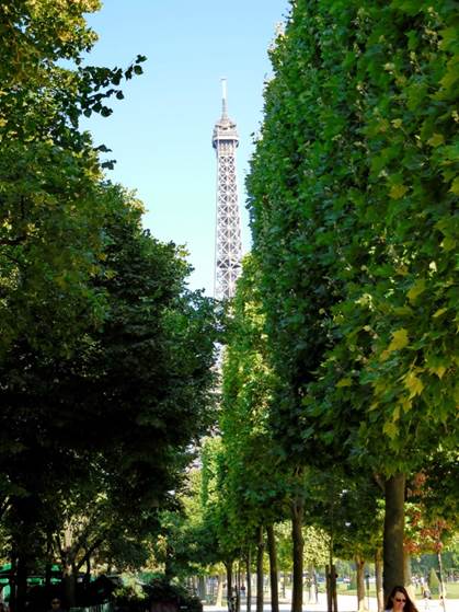 Eiffel Tower as seen from beneath the trees on the Champ de Mars.