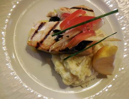 grilled swordfish in a little pool of melted butter with puréed potatoes and