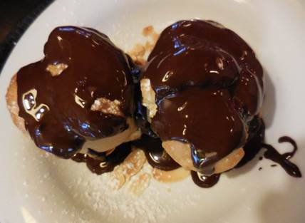 projects here are done with zeal. Yesterday was not such a good day for walking, due to windy rainstorms in the afternoon. But the skies cleared by dinnertime and so we strolled down to Bistro 121, which is always open, even on a Sunday in the middle of August. We had a delicious dinner starting with crab raviolis in a bisque, then grilled swordfish with puréed potatoes for me, and jarret de porc for Tom. Dessert once again was the Bistro’s incomparable profiteroles with their dark, superrich chocolate sauce. August in Paris; life is good.