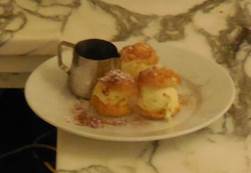 Dirty toothless shrew! Whew! So, to keep the peace, let’s just say it was beef instead of pintade (guinea hen) in the pot au feu last night. I don’t know how prevalent this feeling is against eating ostrich in France, but I don’t really want to find out, either. Tom had the dependably good supreme de volaille with mushrooms on linguini. For dessert, we shared profiteroles with wonderful dark chocolate sauce. We had a long wait for the profiteroles, so we entertained ourselves by looking over the railing onto the area where the bar used to be. Now it is the station where a statuesque red-headed woman assembles desserts. A newer, smaller bar is nearby. That was fine entertainment, and much needed because the wait for our particular profiteroles order was very long. There were many others before us. We could see that the profiteroles are a popular choice, and with good reason.