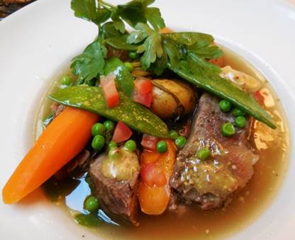 Anything can happen on a holiday. This was our Feast of the Assumption. Any restaurant can have an off night. I wouldn’t say that it was an off night at Le Café du Commerce, because the food and service were really good – with the exception of a little snafu here or there. With the regular A team no doubt away on holiday, you don’t know what the B team might do . . . . We were warmly greeted and given an excellent table. I love to sit on an upper level (only two levels were used last night) right along the railing overlooking the interior atrium in this beautiful three-level restaurant. The weather was nice enough that the retractable glass ceiling was open to the sky. We had such a table overlooking the railing, with a view of the sky as well. Our server was a very competent woman who was perhaps new to Le Café du Commerce, but not new to the profession. The head waiter on that floor tried to help out by taking our drink order. But the order was lost somehow, and by the time our food arrived, we still had no beverages at all. So I had to politely ask for them. We were thirsty after our pre-dinner walk. I ordered the special of the day, pot au feu de pintade, with summer vegetables. Pintade is guinea hen, which is like chicken but more flavorful. However, what arrived at the table was a pot au feu with beef. I’d say it was a beef brisket cut. If it WAS fowl, it had to be ostrich (not guinea hen). We heard the head waiter having quite a discussion with the man at the table behind Tom’s chair about this discrepancy. I decided to say nothing, because the dish was delicious, and I have no problem with eating beef or ostrich. But I could see how someone who did not want beef or ostrich might be upset. The head waiter did not give in. He simply said that this is how the chef of this house prepares pot au feu de pintade. Curious about what the French might think about a pot au feu d’autruche (ostrich), I did an internet search. In response to one chef’s posting of a good video on how to make this dish, the first commentator was livid. He wrote: Saleté!!!!!! comment ose tu